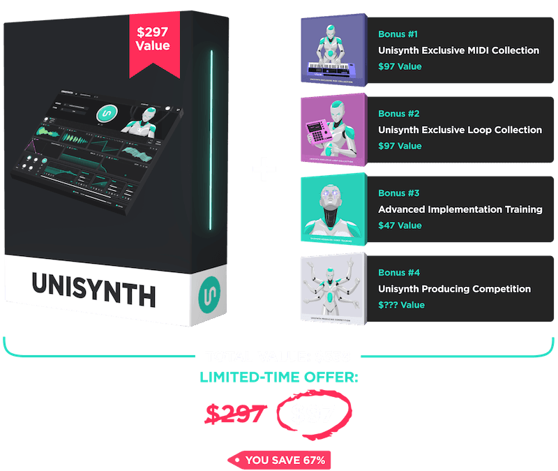 ONE TIME OFFER: Want to take your tracks to the top of the charts? Get 65 famous presets recreated to 100% accuracy from the biggest hit songs of all time to use inside your new Unisynth (fully-customizable). Includes the exact presets from songs by Metroboomin, Drake, Anyma, ZHU, Bad Bunny, Fred Again, Solomun, Bob Marley, Artemis, Travis Scott, SZA, Yeat & more. Normally $97 but you can get it 50% off right now for only $47. Producers who are getting the best results with Unisynth take this option. 100% 60-Day Money-Back Guarantee.